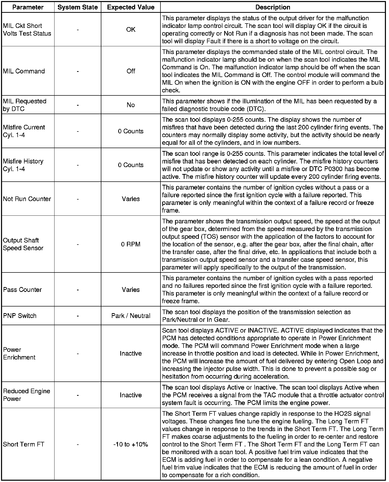 Only the parameters listed below are referenced in this service manual for use in diagnosis. If all values are within the typical range described below, refer to Symptoms - Engine Controls Symptoms - Engine Controls for the 2.4L engine for diagnosis.
