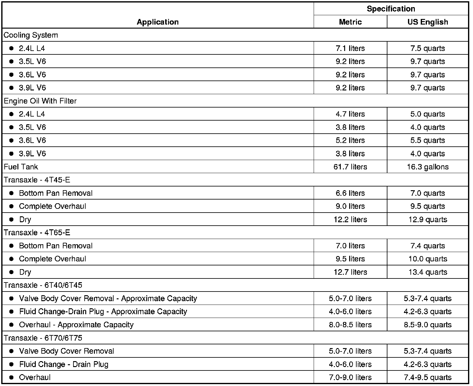 The following approximate capacities are given in US English and metric conversions. See Fluid and Lubricant Recommendations (USA and Canada) Specifications for more information. All capacities are approximate. When adding, be sure to fill to the approximate level, as recommended in this manual. Recheck fluid level after filling.