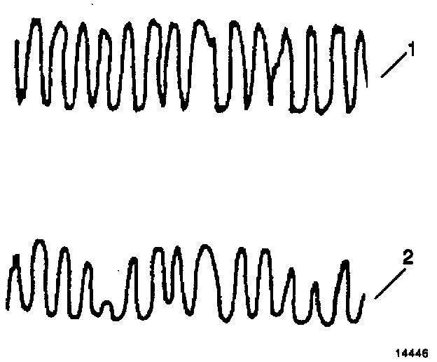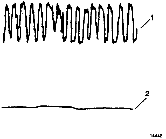 A good TWC catalyst will show a very active output voltage on the pre-catalyst heated oxygen sensor (1). A good catalyst, 95 percent hydrocarbon conversion, will show a relatively flat output voltage on the post-catalyst heated oxygen sensor (2).