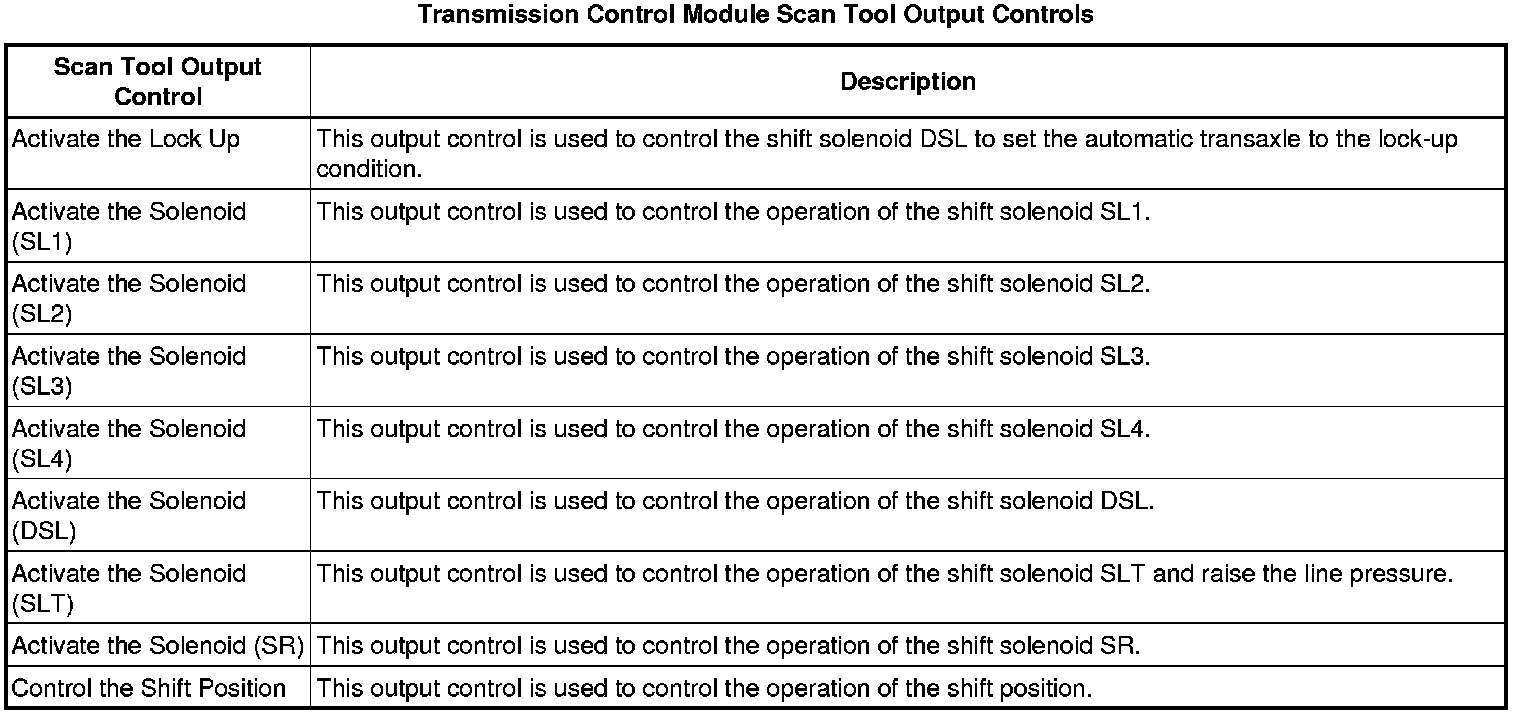 The Transmission Control Module Scan Tool Data List contains all transmission related parameters that are available on the scan tool. The list is arranged in alphabetical order. A given parameter may appear in any one of the data lists, and in some cases may appear more than once, or in more than one data list in order to group certain related parameters together.