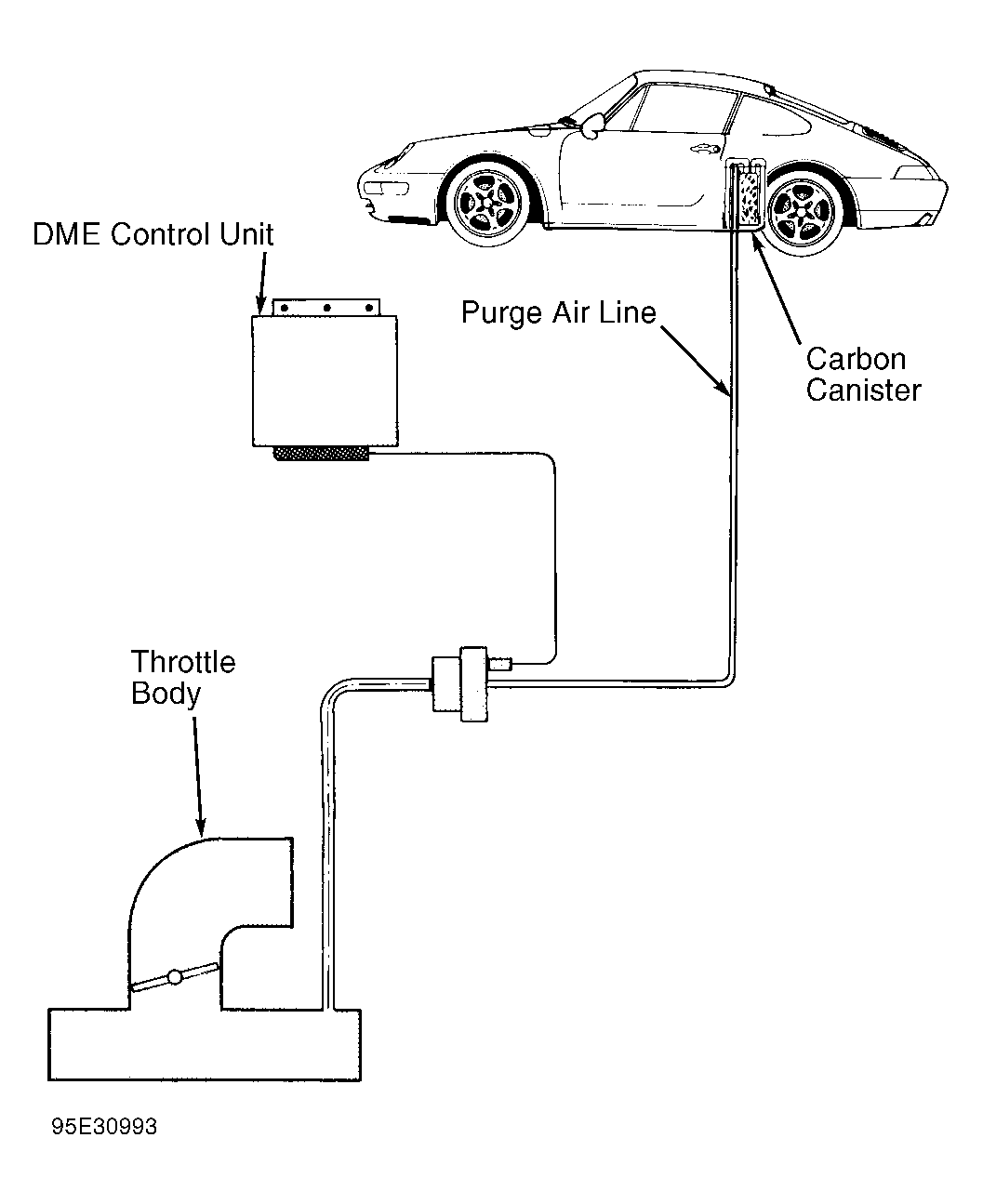 Check fuel vapor lines for damage or restriction. See Fig 1 . Check connector at DME and solenoid valve for corrosion or loose fit. Check hose fitting at throttle body tight fit. Repair or replace as necessary.
