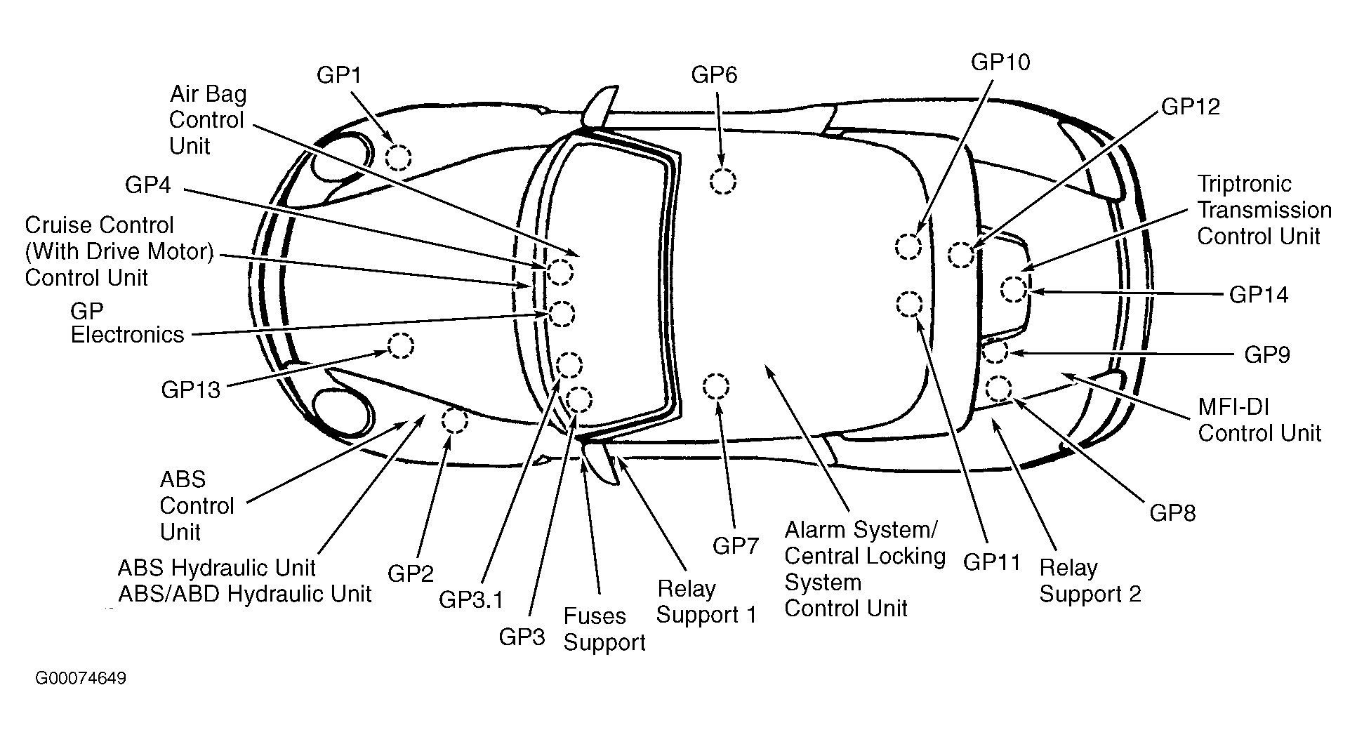 | Tiptronic Transmission Control Unit | On front center of engine compartment. See Figure . |