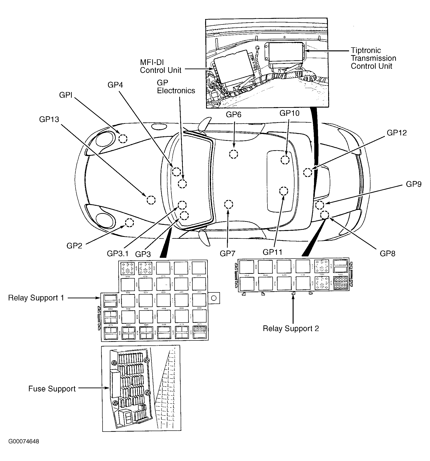| Relay Support 1 | Under left side of dash, in footwell. See Figure. |