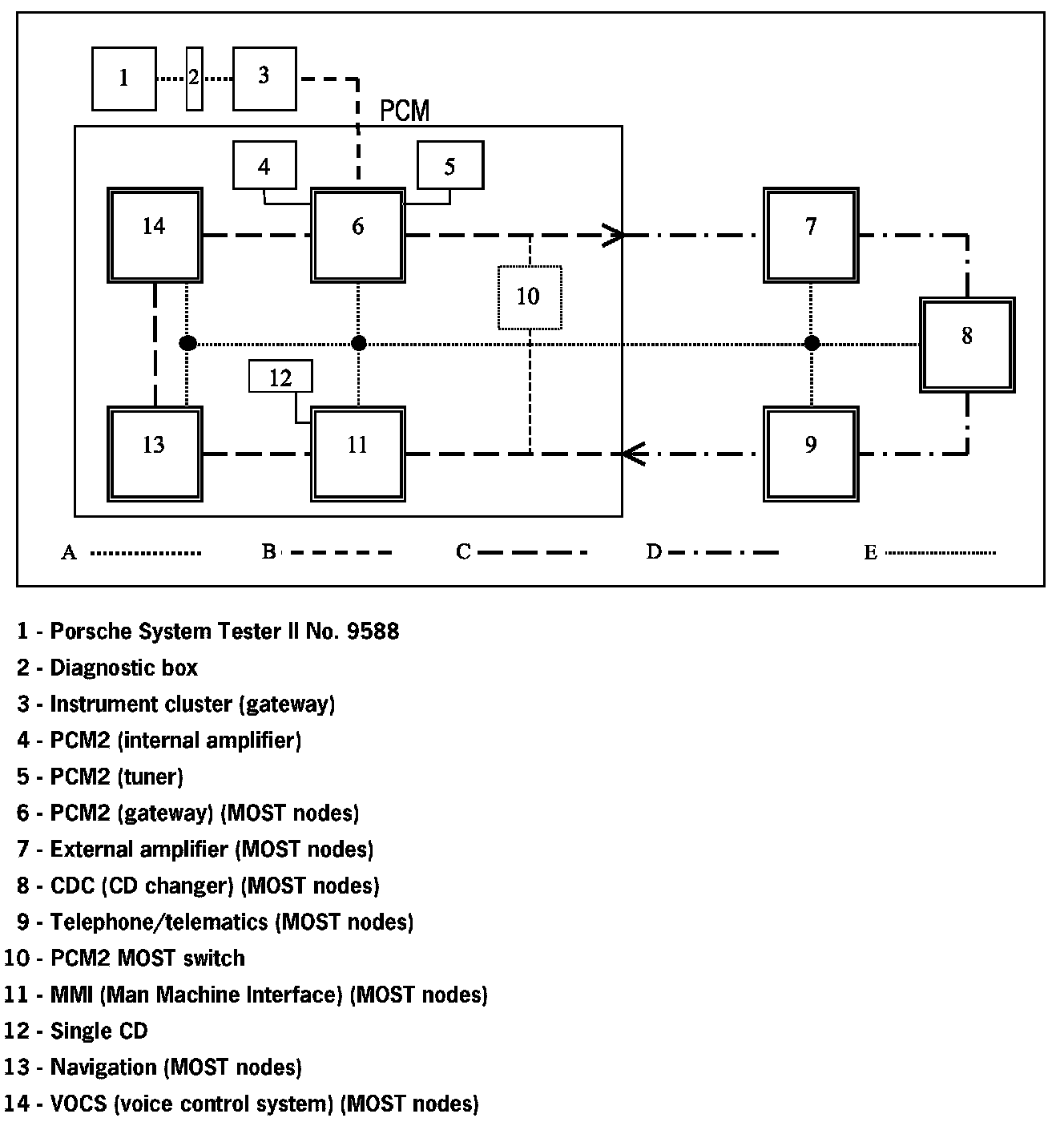 Communication between the Porsche System Tester II No. 9588 and the MOST control modules only takes place via the K lead to the instrument cluster. The data is transferred from the instrument cluster gateway to the MOST control modules, via CAN Comfort to the PCM2 gateway, via the electrical MOST in the PCM2 and via the optical MOST outside of the PCM2.