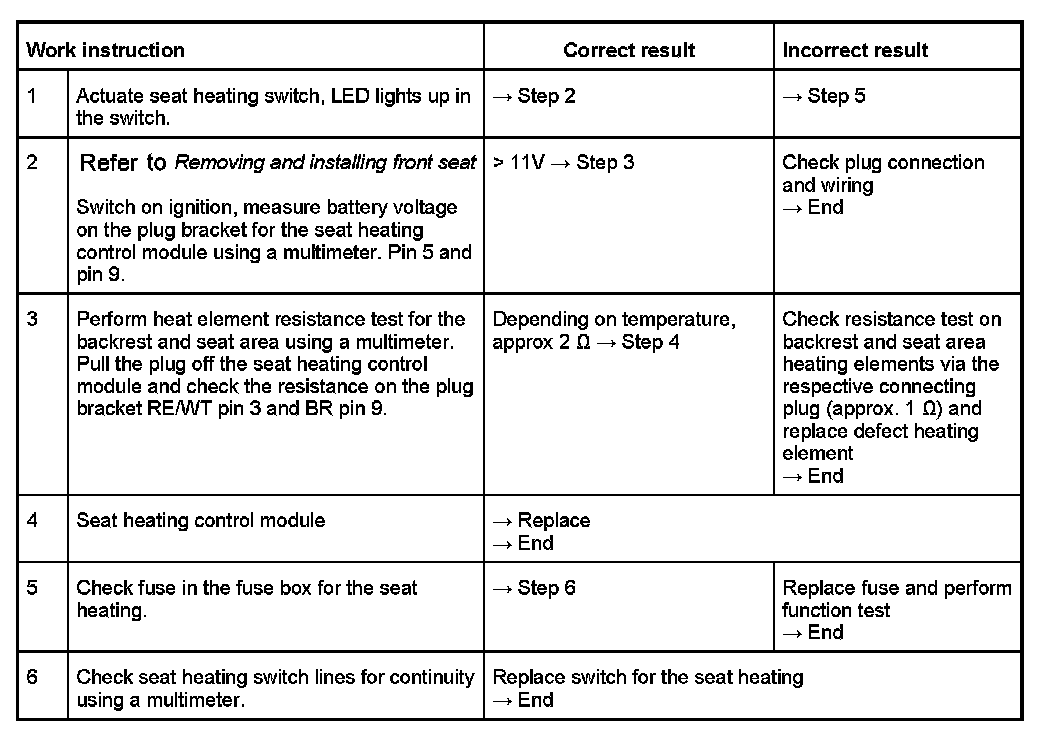 In the case of the complaint "seat heating does not function", proceed according to the following work instruction. Work aids: Use wiring diagram and multimeter.