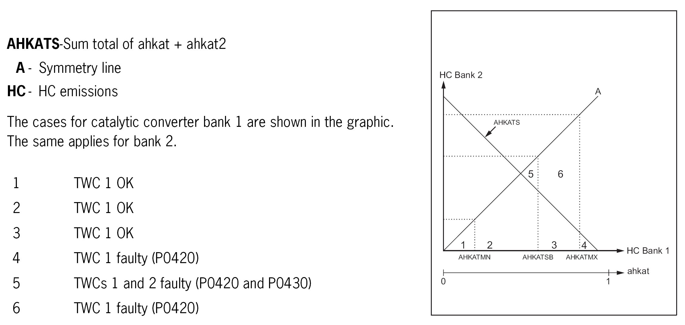 The catalytic converters (bank 1/bank 2) are monitored individually and for the sum of the emissions. There are two threshold values for individual monitoring: