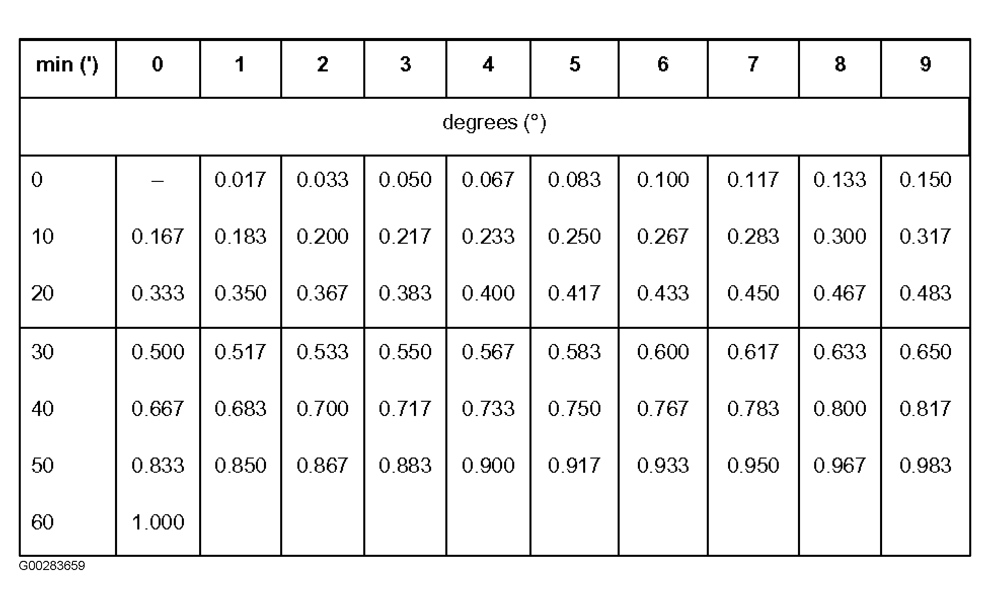 Wheel alignment values are specified in degrees and minutes. If a conversion from minutes to decimal degrees is needed, see Fig 1 .