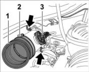 1. Remove rubber sleeve for intake-air distributor -1-. Unscrew the screw-type hose clamp -2- for this purpose.