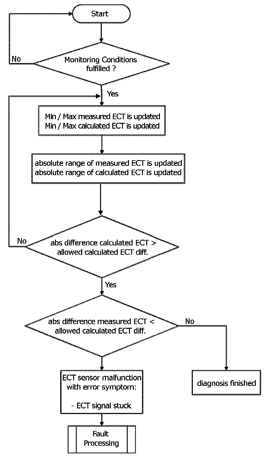 After engine start the system stores continuously the lowest and highest ECT. In case that after several driving conditions the difference between ECT max and ECT min is lower than the threshold the sensor stuck at high values.