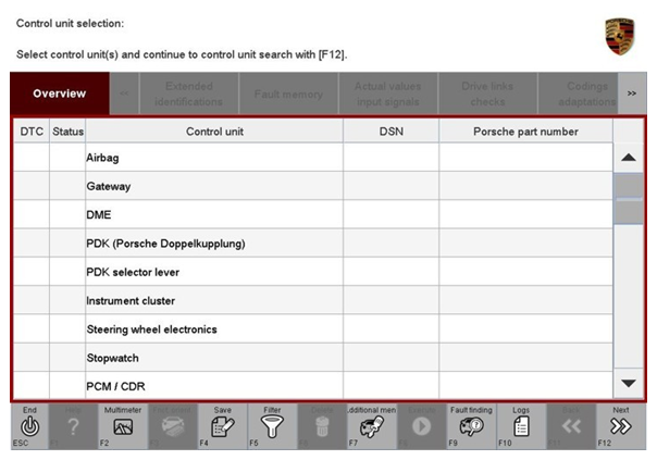 The diagnostic application is then started and the control unit selection screen is populated.