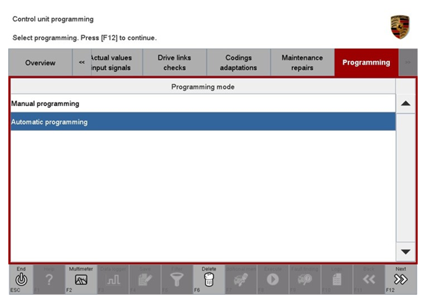 Home >> Porsche >> 2013 >> Cayenne Base, Automatic Trans >> Repair and Diagnosis (Single Page) >> Electrical >> Motors, Switches, Relays >> 9X - Electrical System - General -- 92A Cayenne >> WM 9X00IN Basic Instructions And Procedure For Control Unit Programming Using The PIWIS Tester (Cayenne, Cayenne GTS & Cayenne Turbo S) >> Basic Procedure For Control Unit Programming Using The PIWIS Tester >> Control Unit Programming Using The "Programming" Menu
