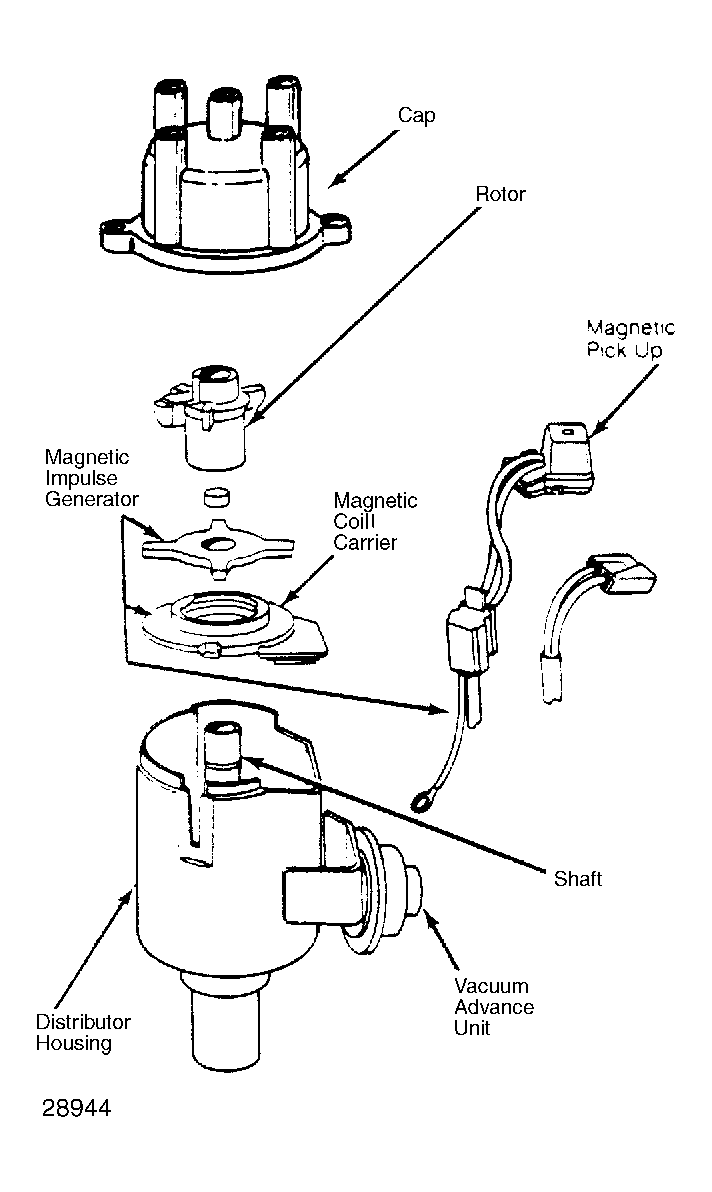 1. Remove distributor cap, rotor, and plastic protector. Remove screw in the side of distributor. Pull upward on electrical connector to remove it from distributor housing. Remove 2 screws securing magnetic pick-up coil. See Figure.