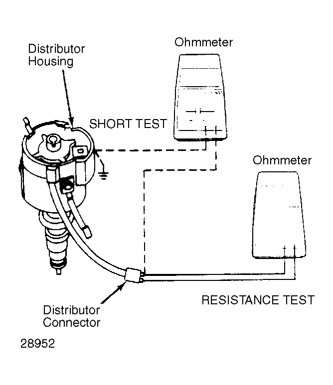 Using an ohmmeter, connect leads to engine ground and either terminal of harness connector leading to distributor. An infinity reading should exist. If not, replace magnetic pick-up coil and harness assembly. See Figure.