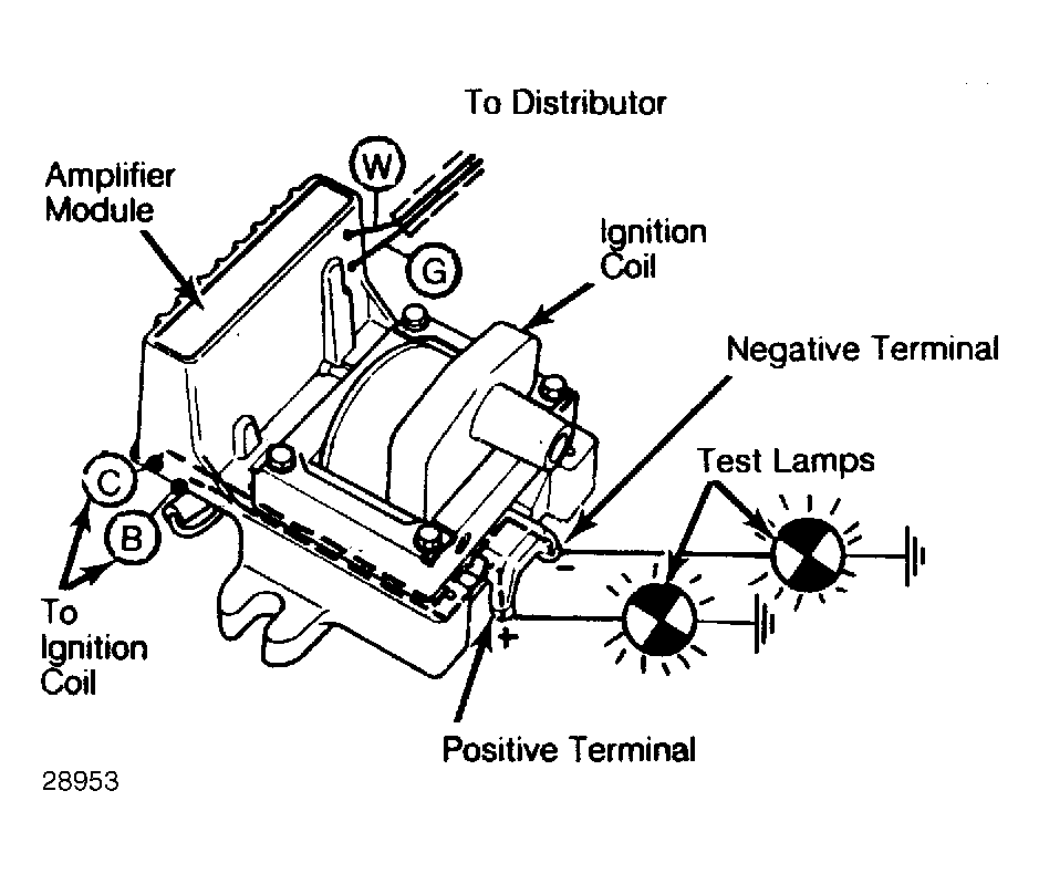 2. Connect test lamp between the coil negative terminal and ground. Turn ignition on. Test lamp should again light. If not, check if coil primary circuit is broken or if amplifier module's power transistor is shorted.