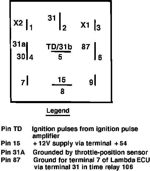 At engine speeds above 3800 RPM and before the throttle butterfly has passed the 72° position, there is a signal from terminal 1 in the throttle position sensor to terminal 31A in the speed relay, Fig. 31. Therefore, terminal 7 in the ECU is grounded via terminal 87 in the relay, and terminal 31 in the speed relay is grounded via terminal 31 in the time relay, resulting in a pulse ratio of 85% being selected.