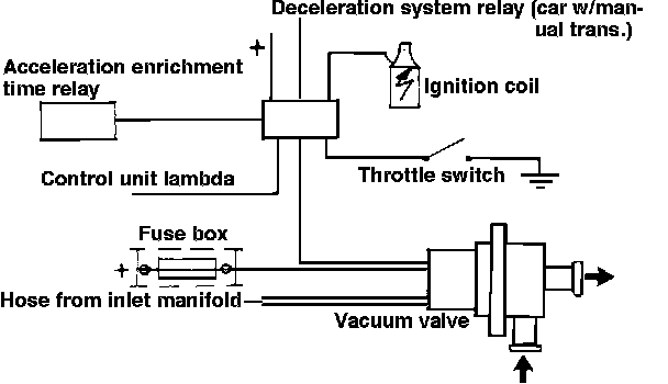 The vacuum valve, Fig. 62, causes air to bypass the flow sensor when the deceleration fuel cut relay is activated, and the relay also signals the oxygen sensor control system to maintain a fixed pulse ratio of approximately 60%. The deceleration fuel cut relay is activated when the throttle switch closes with engine speed above 1400-1750 RPM, the relay switch is in the rest position, and when the coolant temperature above 113°F (thermostatic switch closed). The relay remains activated until engine speed drops below 1300-1450 RPM, or until the acceleration enrichment timer is activated by the opening of the throttle switch.
