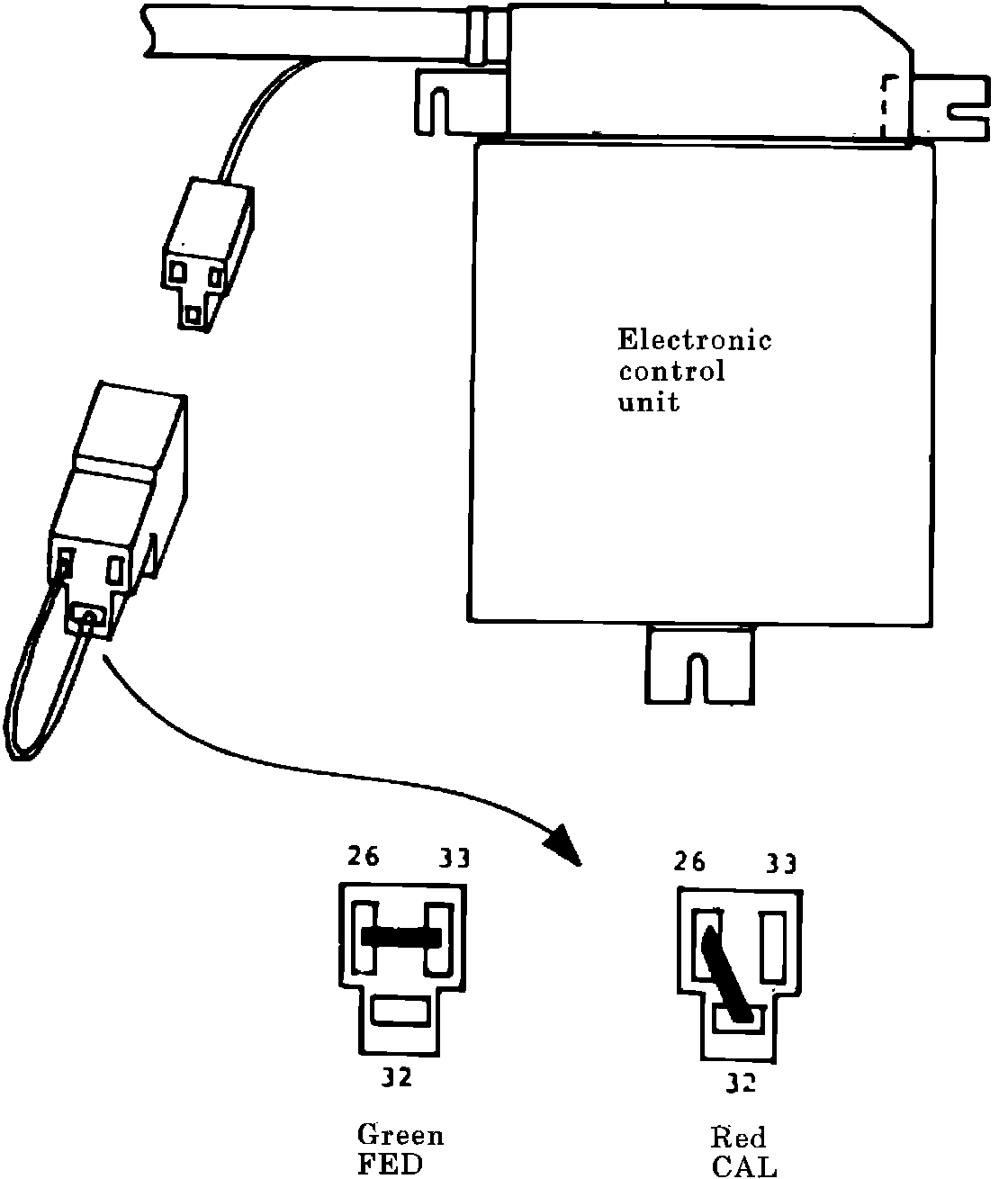 3. Remove three control unit retaining screws and the control unit. The connector shown in Fig. 6 is to be used in conjunction with a ``Lambda Correction Plug.'' This will facilitate the use of the same electronic control unit in either a Federal or California vehicle. Use a green correction plug for Federal vehicles or a red plug for California vehicles.
