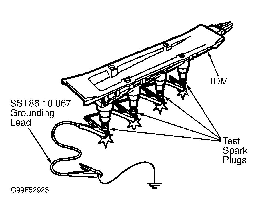 Connect TECH 2 scan tool to Data Link Connector (DLC). Remove ignition discharge module. Inspect IDM seals, springs and electrical connector for wear or damage. See Fig 1 . Repair or replace as necessary. Reconnect electrical connector. Install test spark plugs into IDM and connect SST 86 10 867 spark plug grounding lead (or equivalent). See Fig 2 . Turn ignition on. Keep IDM in upright position and use scan tool to select ACTIVATE: IGNITION COIL CYL 1-6. Test several cylinders to compare to each other. If any ignition coil does not spark, replace IDM.