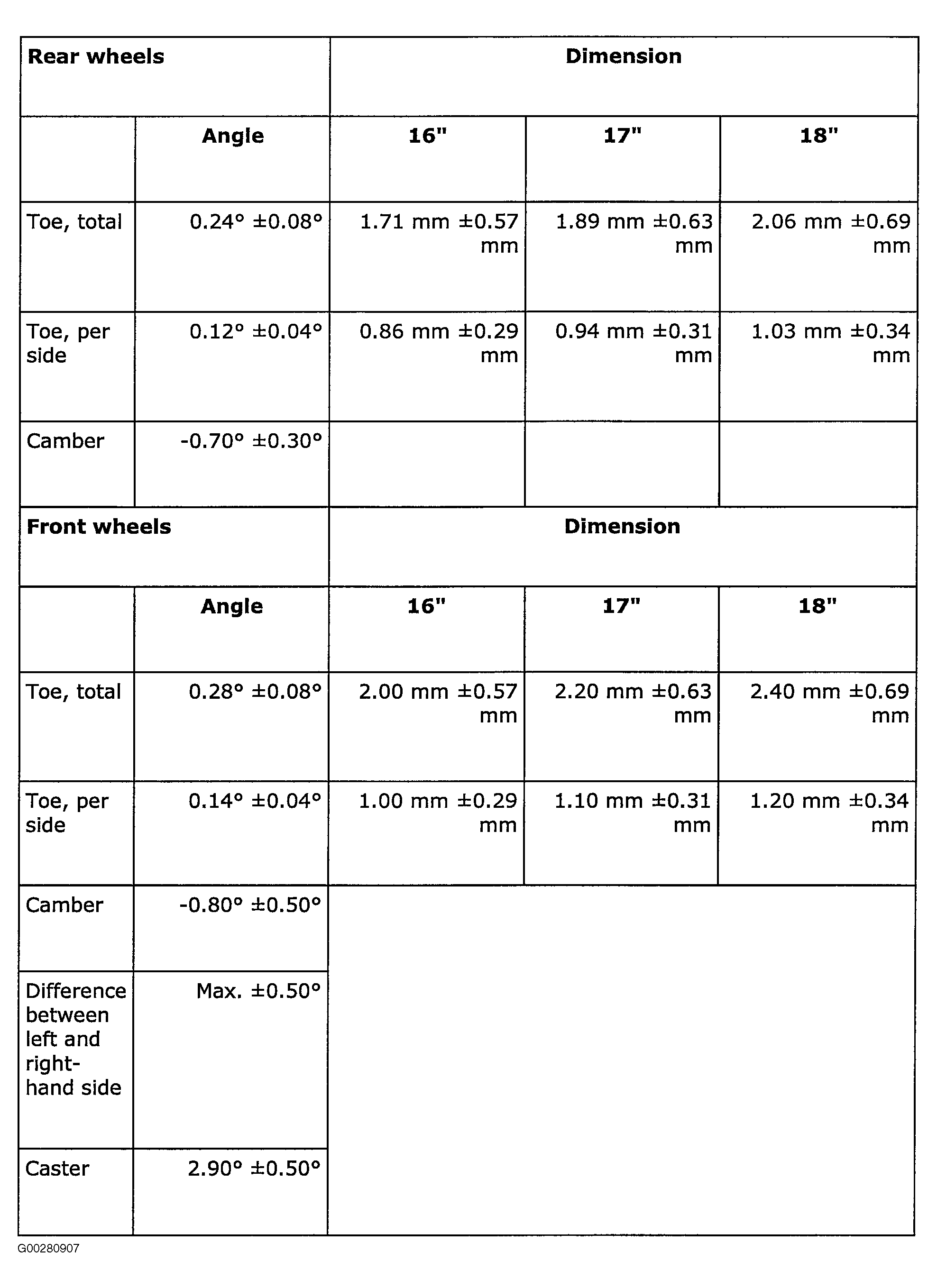 Fig 1: Wheel Alignment Specifications (Standard Chassis)