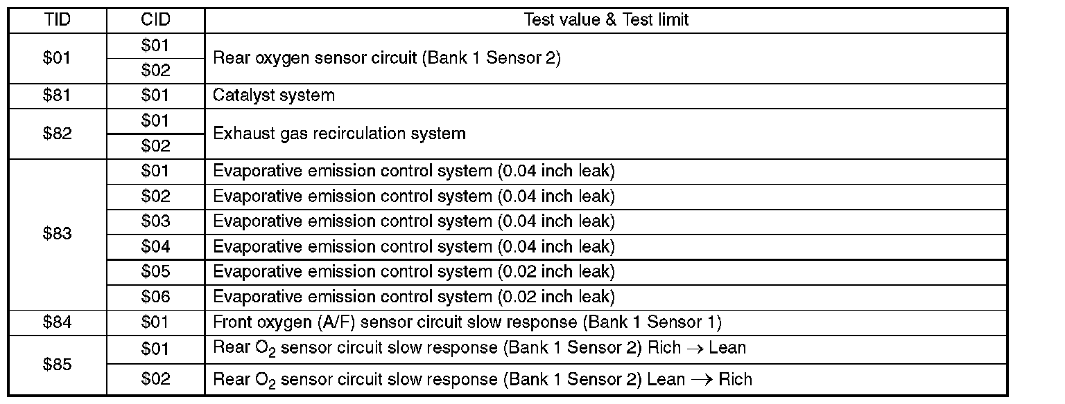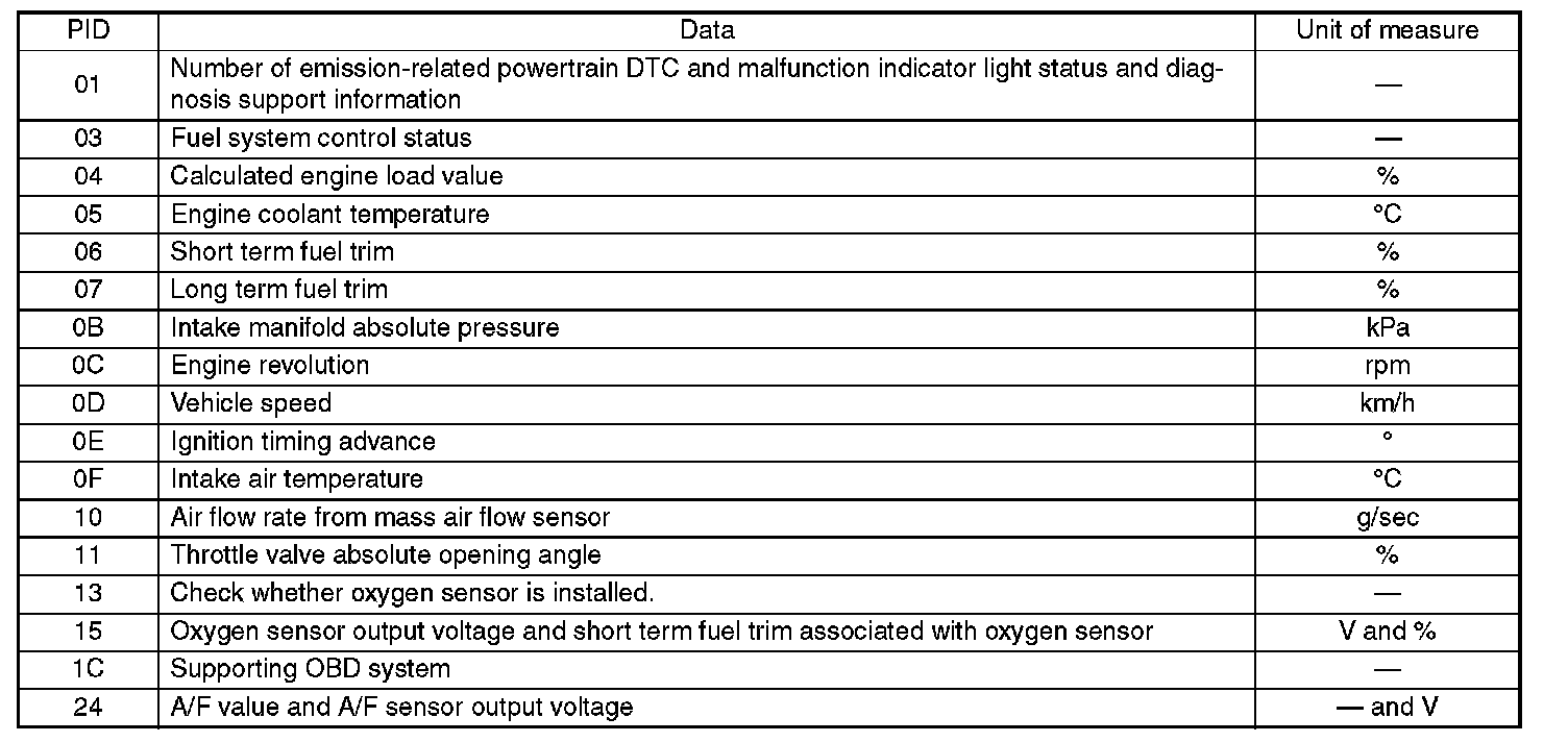 Refers to data denoting the operating condition when trouble is sensed by the on-board diagnosis system. A list of the support data and PID (Parameter Identification) codes are shown in the table.