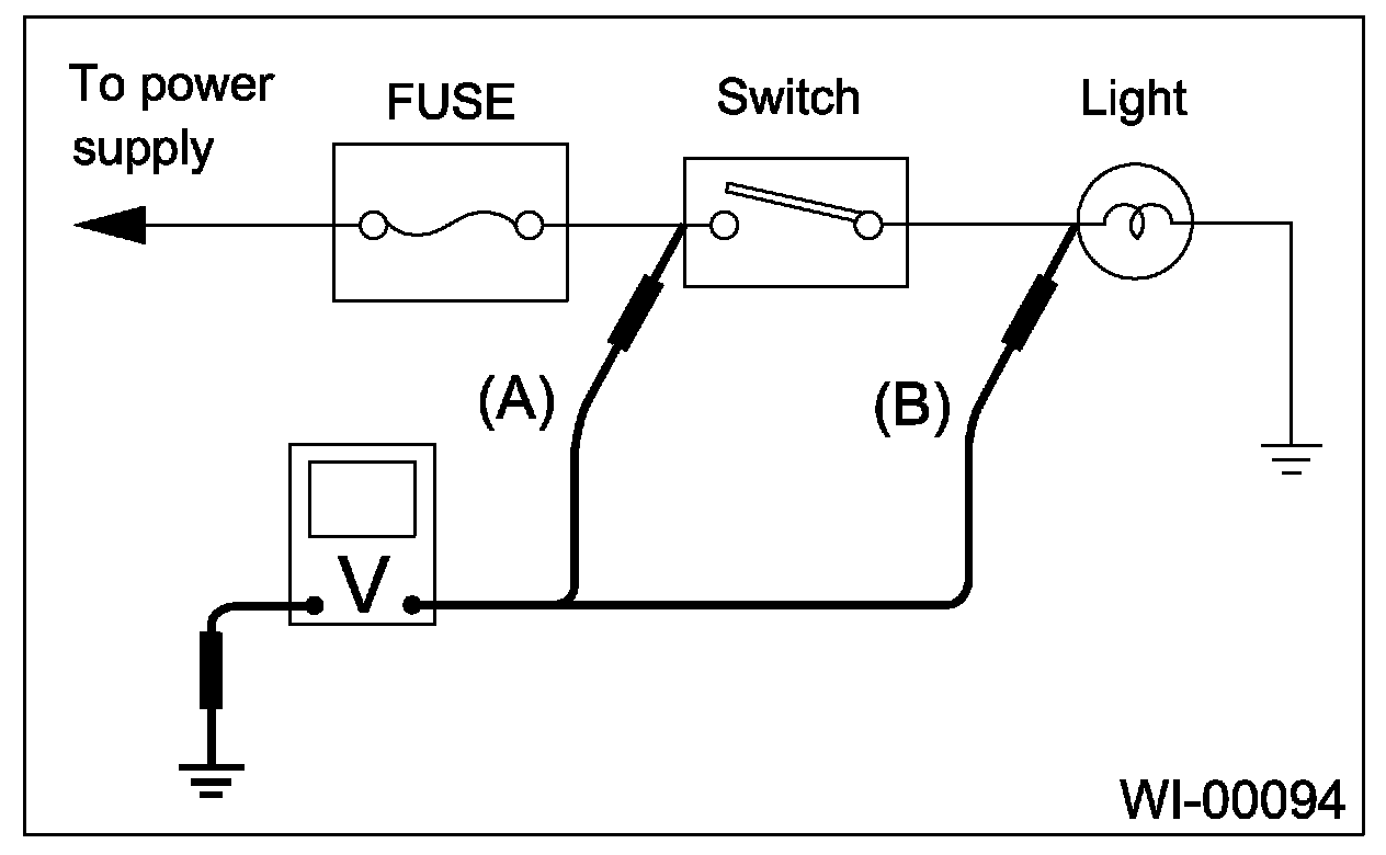 Contact the positive lead of the voltmeter on connector (A). The voltmeter will indicate a voltage.
