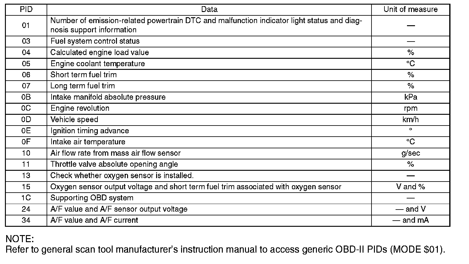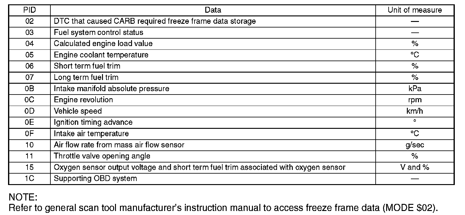 Refers to data denoting the operating condition when trouble is sensed by the on-board diagnosis system. A list of the support data and PID (Parameter Identification) codes are shown in the table.