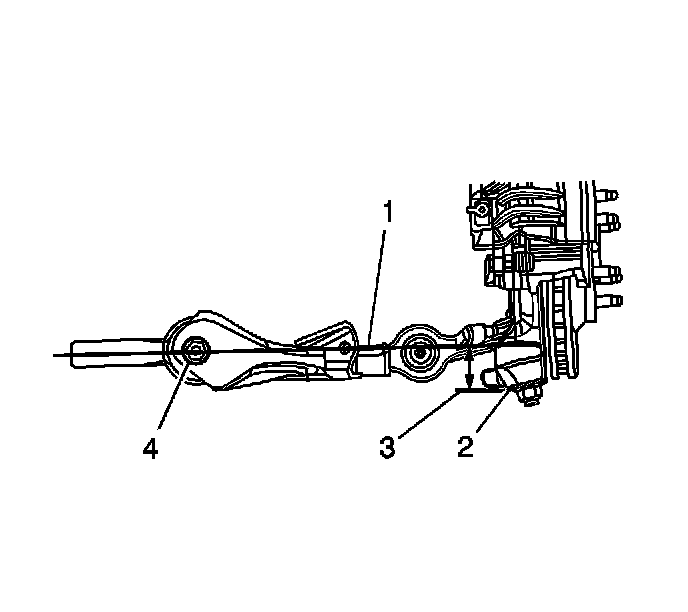 3. Measure from the centerline (1) of the lower control arm bushing bolt (4) down to the machined edge of the steering knuckle (2) in order to obtain Z height measurement (3).