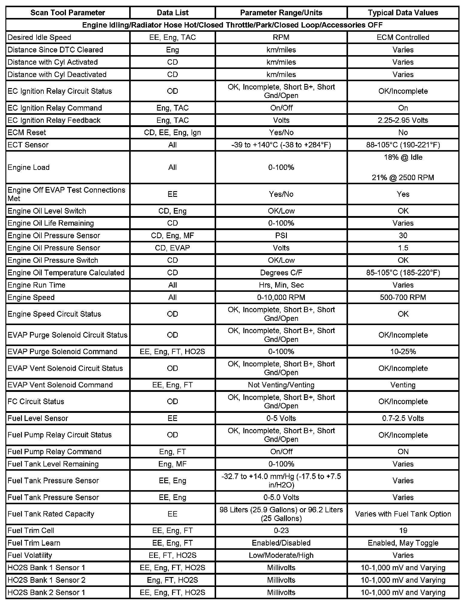 The Engine Scan Tool Data List contains all engine related parameters that are available on the scan tool. The list is arranged in alphabetical order. A given parameter may appear in any one of the data lists, and in some cases may appear more than once, or in more than one data list in order to group certain related parameters together.