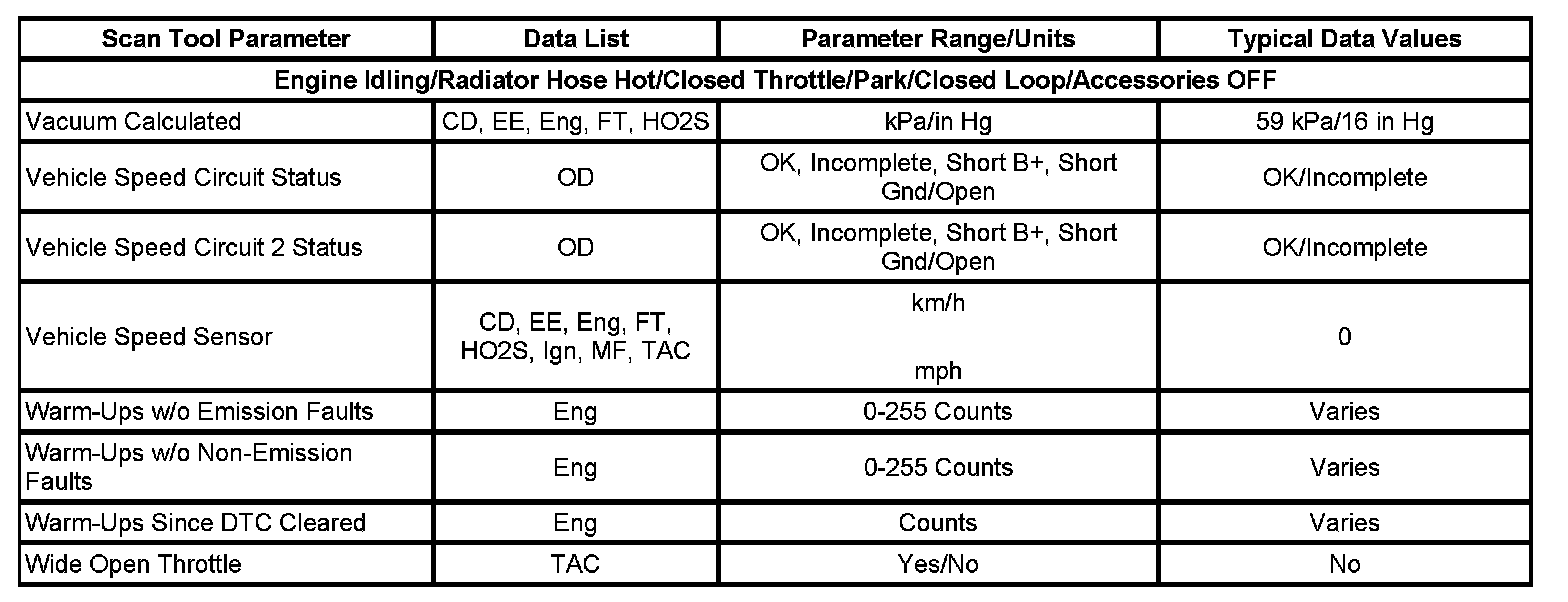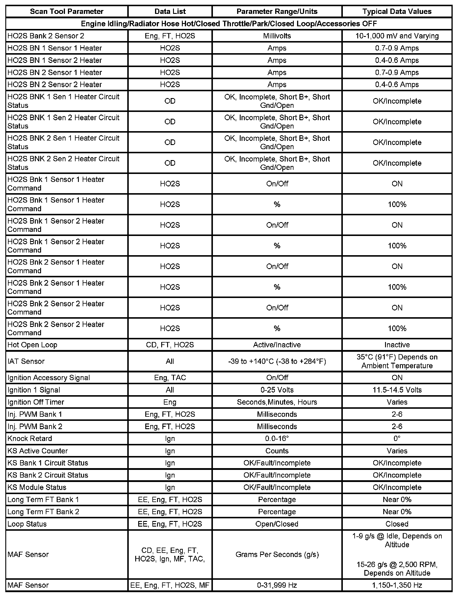 Scan tool values from a properly running engine may be used for comparison with the engine you are diagnosing. The Engine Scan Tool Data List represents values that would be seen on a normal running engine at idle.