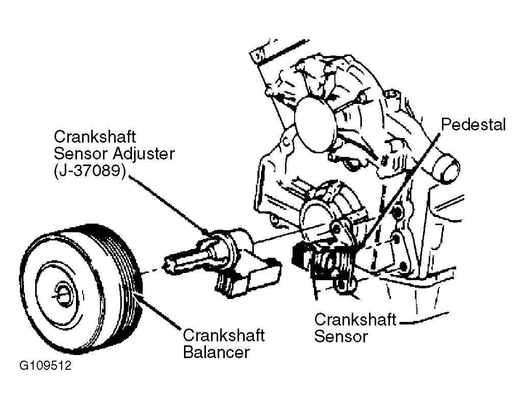 - Loosely install sensor on pedestal. Position sensor with pedestal attached onto Installer (J-37089). See Fig 1. Position installer onto crankshaft.