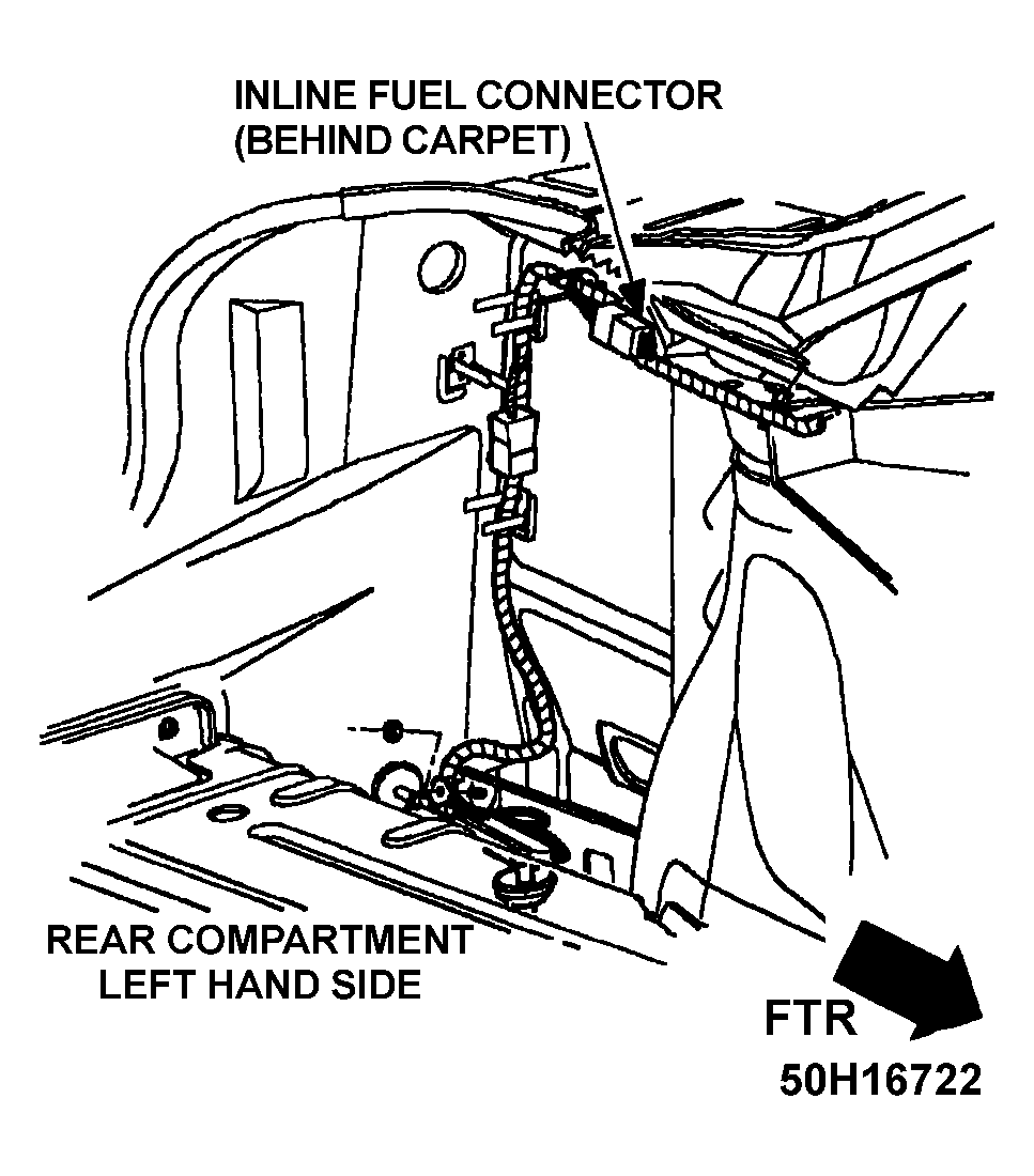 6. Apply battery voltage to fuel pump test connector using a 10-amp fused jumper wire. Fuel pump test connector is located in rear compartment on driver's side behind carpet. See Figure . Observe fuel pressure reading. If fuel pressure is still not present, check wiring between test connector and fuel pump. If wiring is okay, replace fuel pump.
