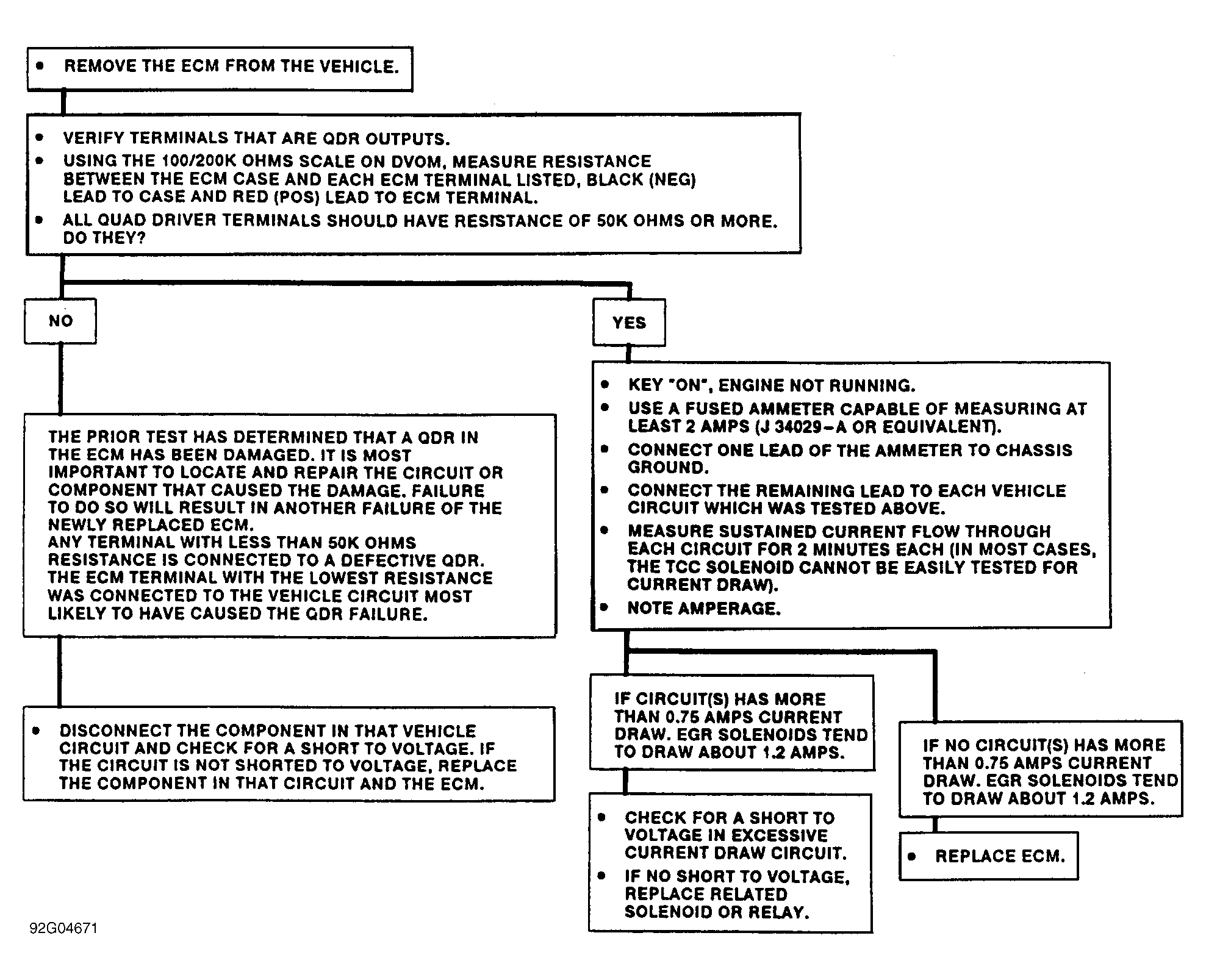 Many test procedures and test charts in ENGINE PERFORMANCE lead to conclusion that ECM is faulty. Before replacing ECM, check driven circuits and ECM Quad-Drivers (QDR) using following procedures and accompanying flow chart. See Fig 1 .