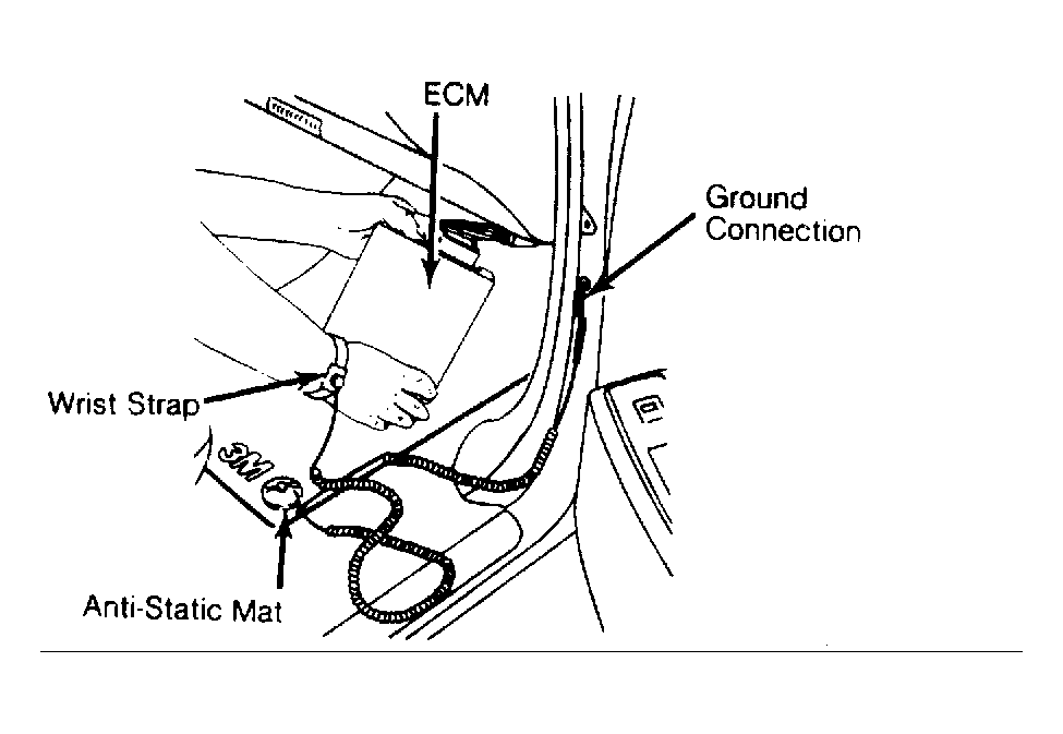 Electronic components used in control systems are designed to carry very low voltages. As little as a 30-volt charge created by static electricity can cause a total or degrading failure in ECM/PCM or other electronic components containing integrated circuits. Before servicing ECM/PCM, ground yourself and ground work area to discharge stored electricity.