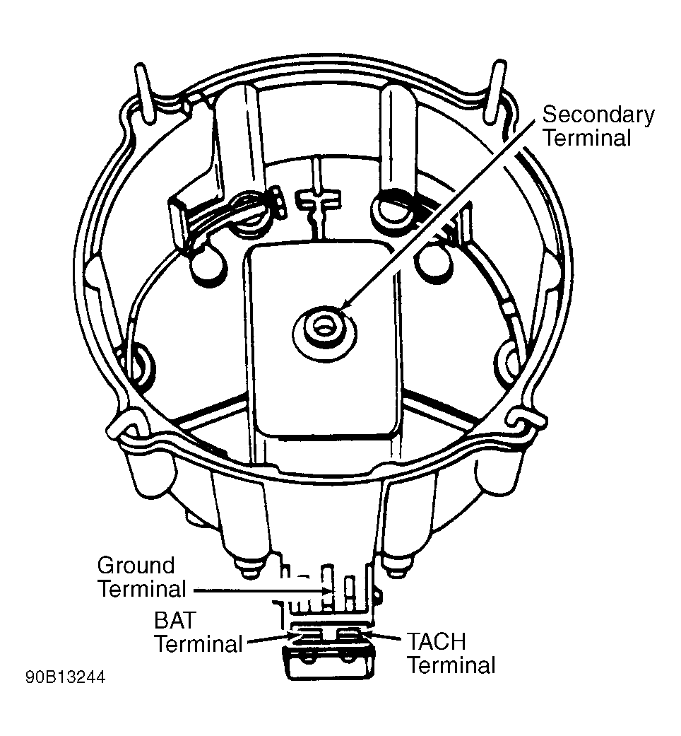 - Turn ignition off. Remove distributor cap and coil assembly. Invert cap. See Fig 1. Set ohmmeter to low scale. Connect leads to coil BAT and TACH terminals. Resistance should be zero or nearly zero. If resistance is not zero or nearly zero ohms, replace ignition coil.