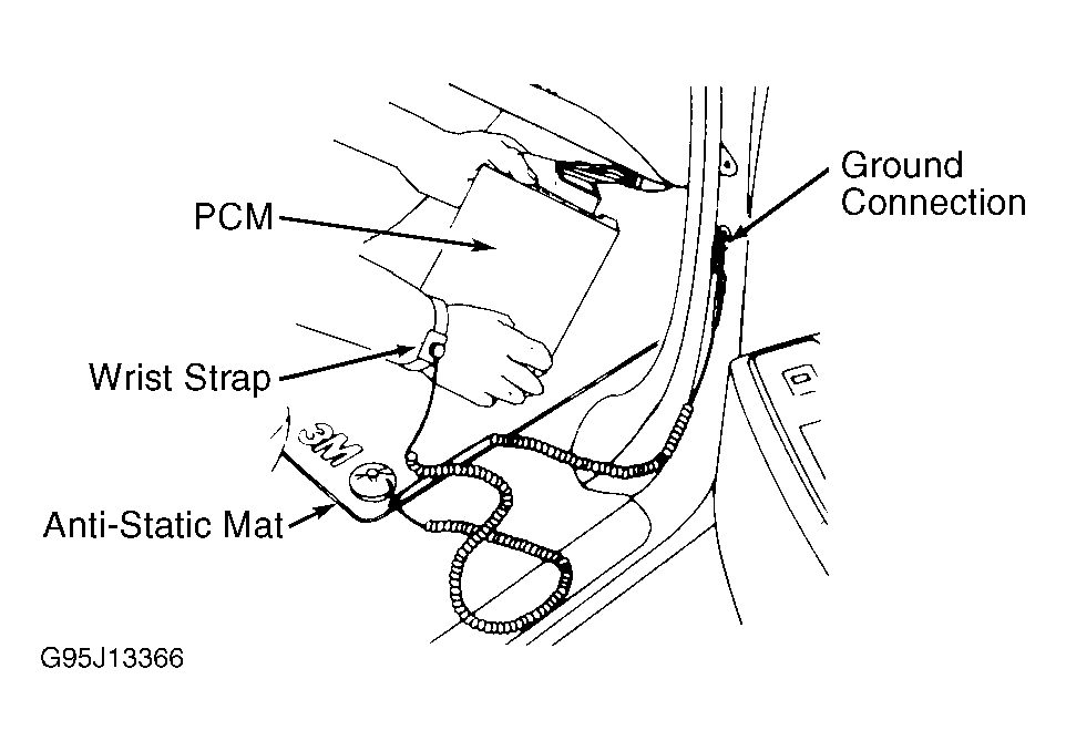 Electronic components used in control systems are designed to carry very low voltages. As little as a 30-volt charge created by static electricity can cause a total or degrading failure in PCM or other electronic components containing integrated circuits. Before servicing PCM, technician must ground himself and the work area to discharge static electricity.
