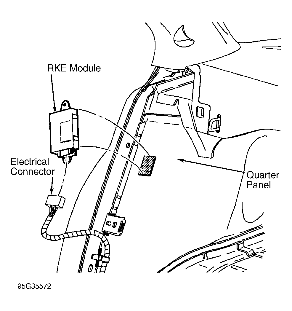 - On all models, disconnect RKE module connector. Pull firmly on RKE module from top to bottom to disengage it from quarter panel. See Fig 1