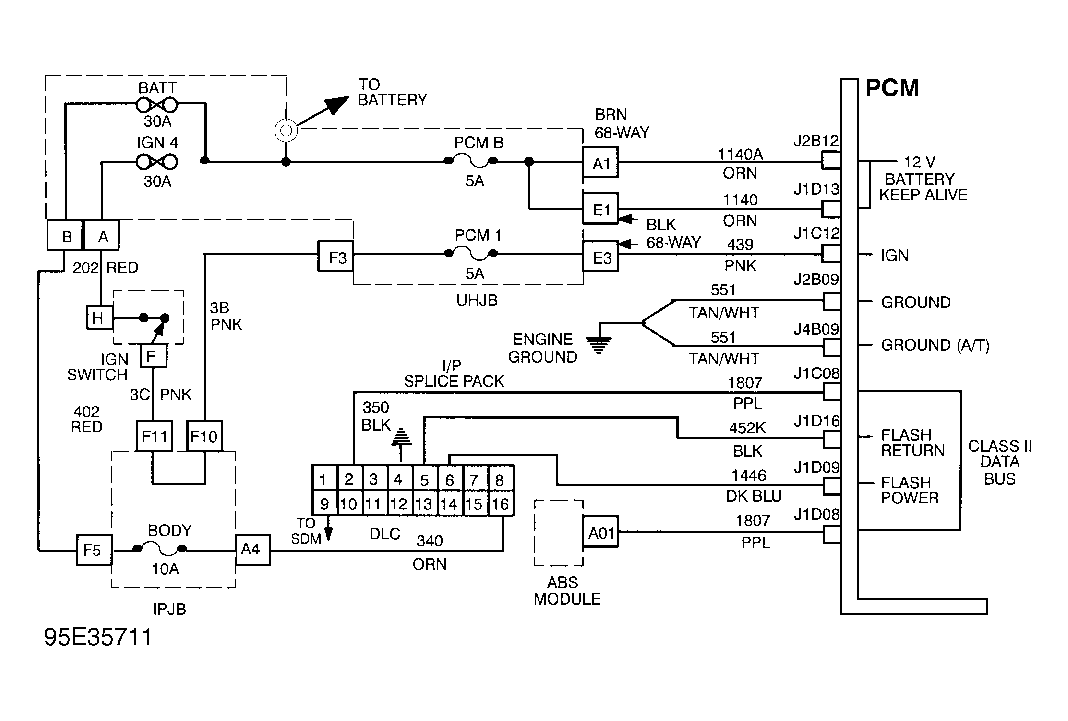 8. Check PCM circuit No. 1807 (Purple wire). If circuit is okay and vehicle is not equipped with ABS, try scan tool on another vehicle. If scan tool is okay, check for terminal tightness or faulty PCM. Repair as necessary. If circuit is okay and vehicle is equipped with ABS, go to next step.