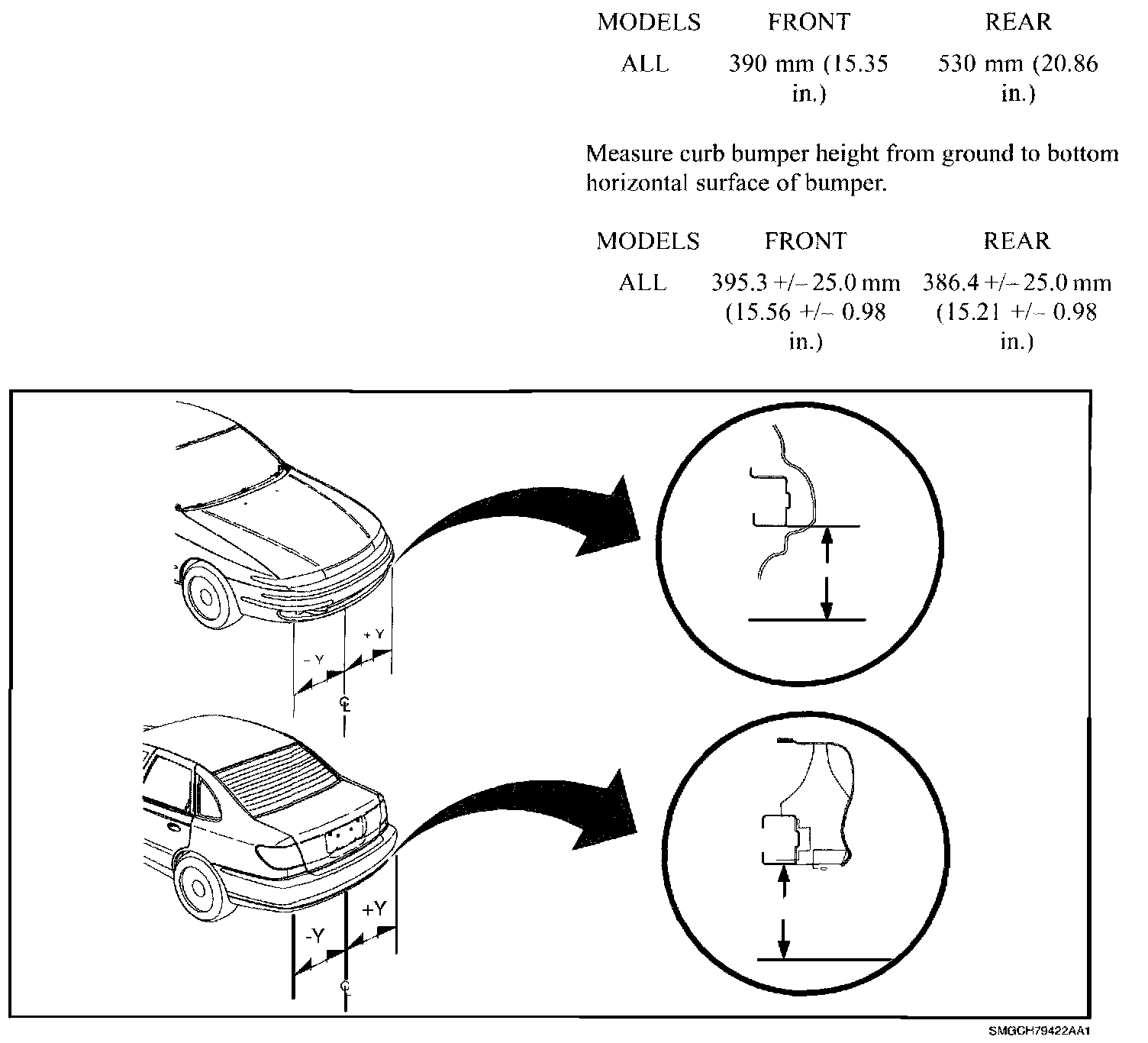 When measuring alignment angles, it is critical that the vehicle bumper height be correct. Measure and adjust bumper height according to the following procedure before performing alignment.