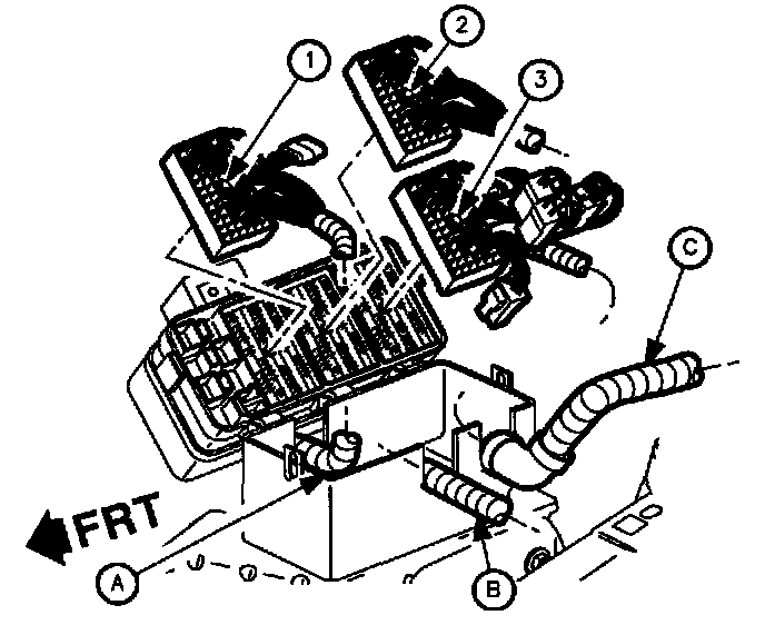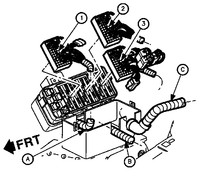 13. Remove routed harnesses. (Engine (A), Forward Lamp (B), and I/P (C).)