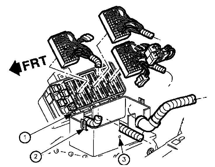 10. Push in tabs (3) on the end of the fuse block case and roll back the fuse block (1).