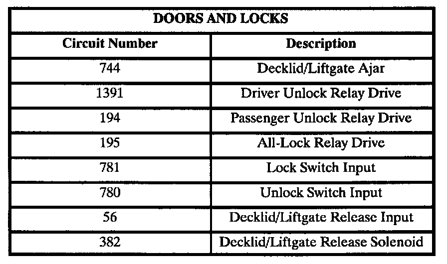 Circuit assignments for the Body Control Module (BCM) relating to doors and locks: