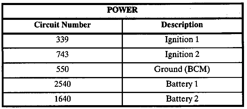 Battery voltage is supplied to the BCM by circuit 2540. This input is internally monitored by the BCM for proper operating voltage. The proper operating voltage range is from 9 to 16 volts.