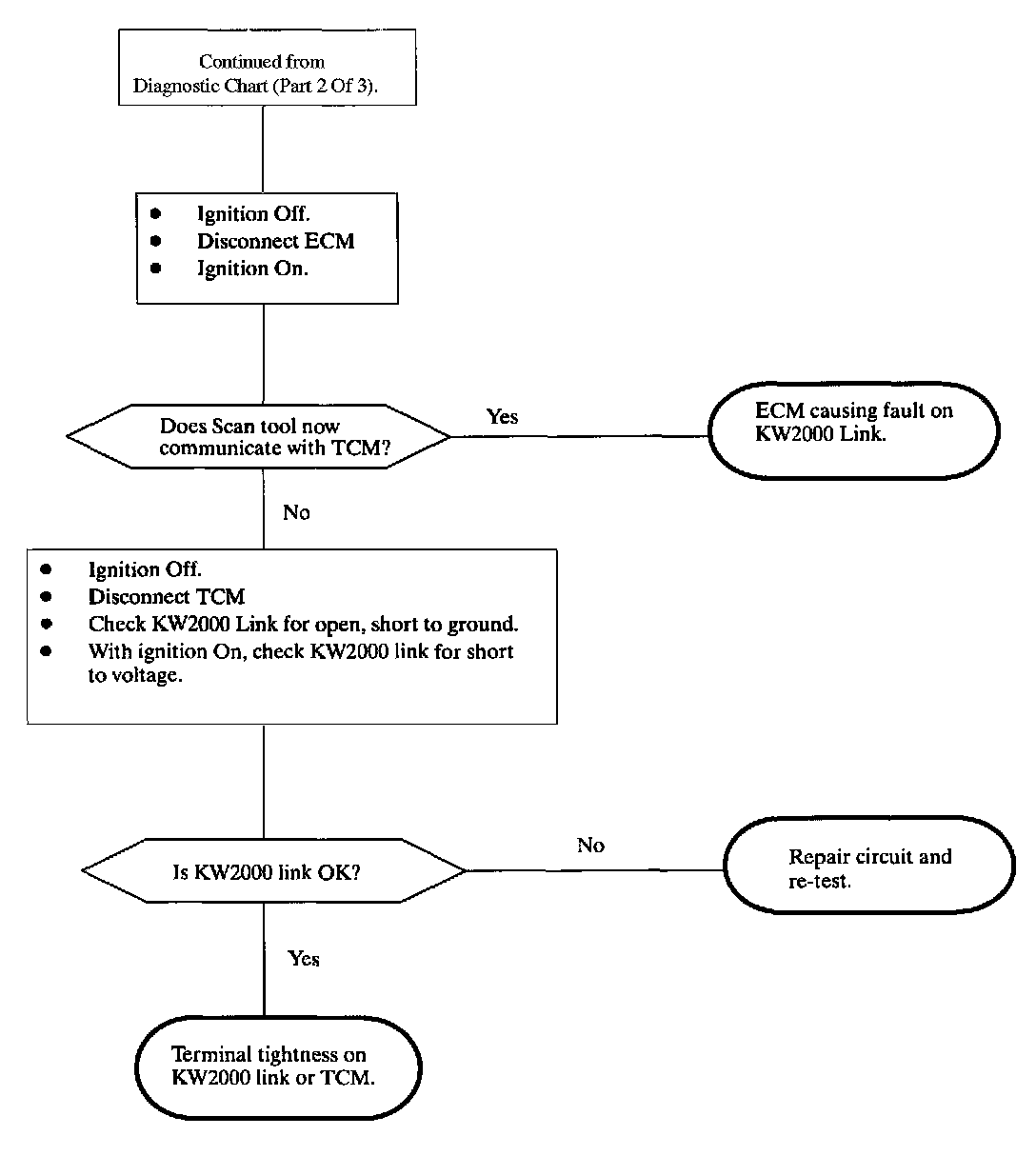 The BCM did not indicate any DTCs relating to the ECM or TCM up to this point in the "Vehicle On-Board Diagnostic System Check." Since the Scan tool cannot communicate with the ECM or TCM, this chart will diagnose faults associated with the KW2000 data link.