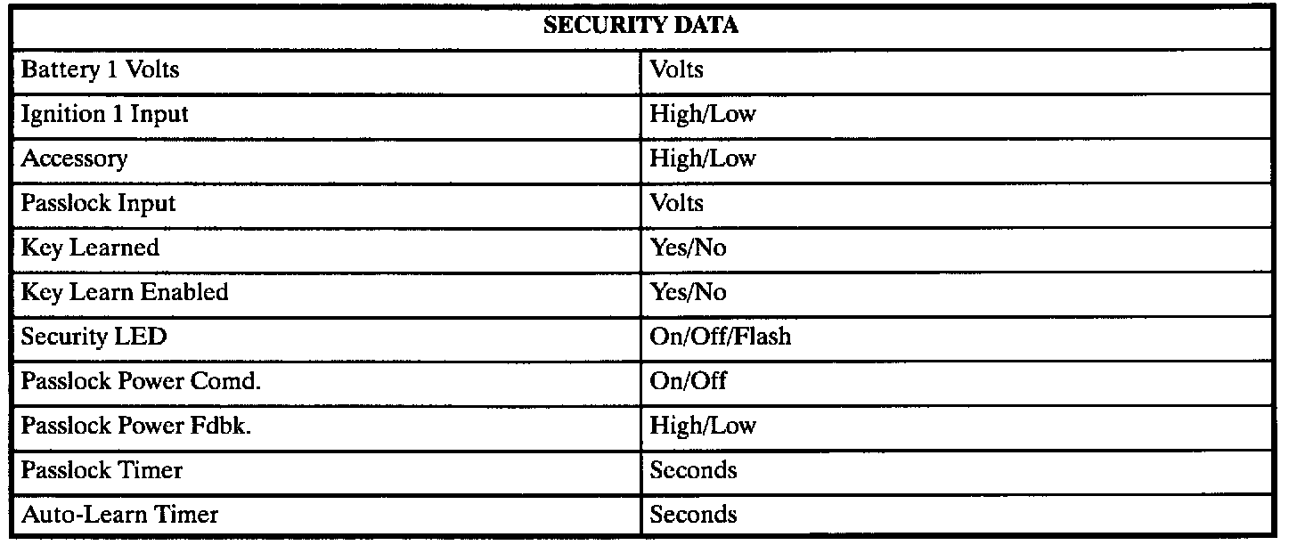 The table lists the security data directly connected to the body control module (BCM) related to the Passlock System only: