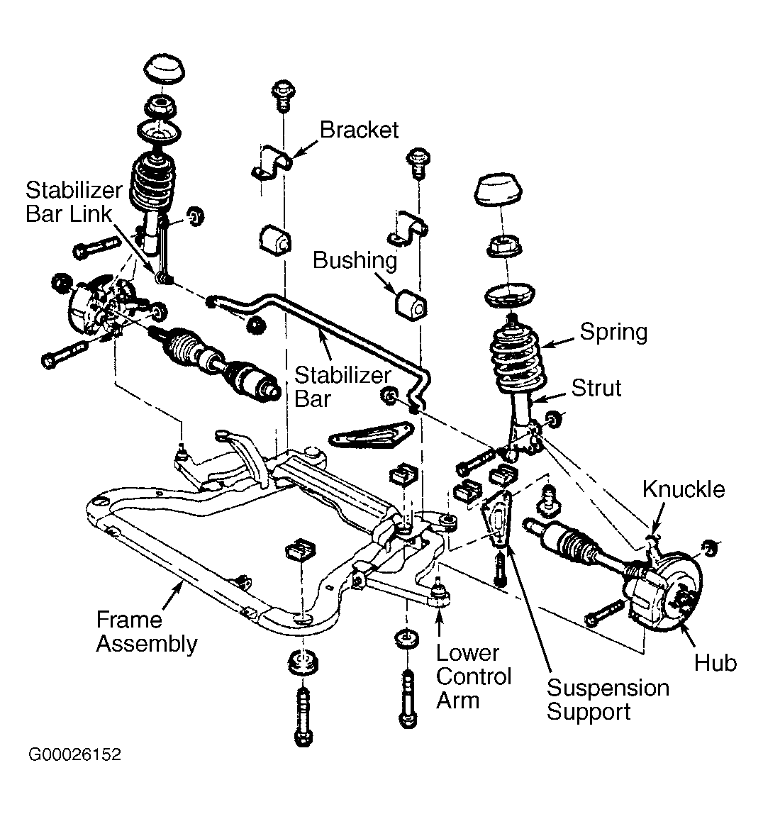 Front suspension uses a MacPherson strut suspension to provide spring support and shock absorption. See Fig 1. Top of strut is attached to vehicle body. Bottom of strut is attached to steering knuckle. Steering knuckle is attached to control arm by a ball joint. Stabilizer bar is clamped to the frame assembly and linked to the strut assembly.