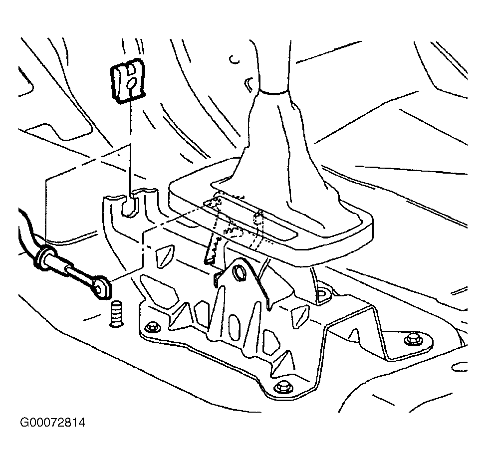 - Route control cable through cable bracket on powertrain mount, and secure cable into bracket. Install control cable retaining clip. See Figure. Connect control cable end to control assembly lever.
