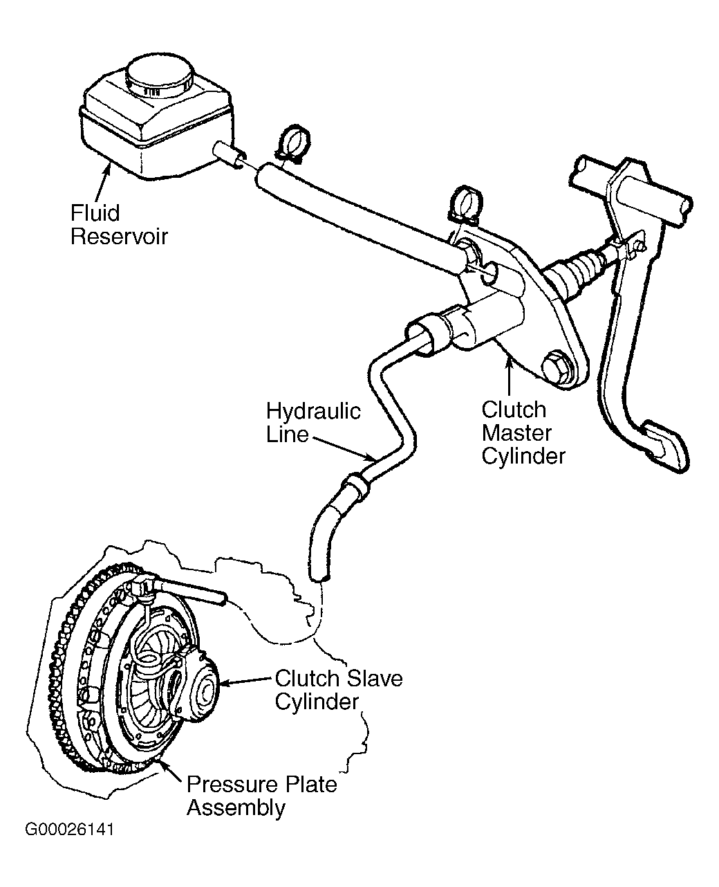 Clutch assembly consists of a single-plate clutch disc and a diaphragm spring-type pressure plate. Hydraulic clutch release system consists of clutch pedal, clutch master cylinder, slave cylinder and permanently lubricated clutch release bearing. See Fig 1 .