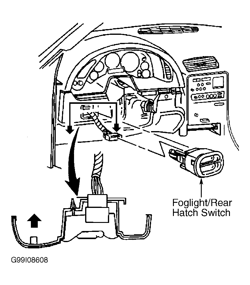Carefully pry the lower edge of the foglight/rear hatch switch to release locking tab. See Fig 1. Disconnect electrical connectors and remove switch. To install, reverse removal procedure.