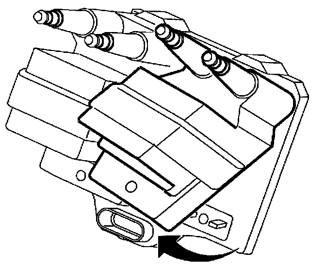 The EI module and coil pack is located on the transaxle housing attached to the spark plug wires. The Electronic Ignition (EI) module charges and discharges the coils based on PCM control. The PCM uses a high control signal of near 5 voltsto charge up the coil and a low control signal of near 0 volts to discharge the coil. If the coil is charged and the control signal is low, the coil will fire through its secondary towers. The PCM controls spark timing and dwell (spark On-time) under all engine running conditions.