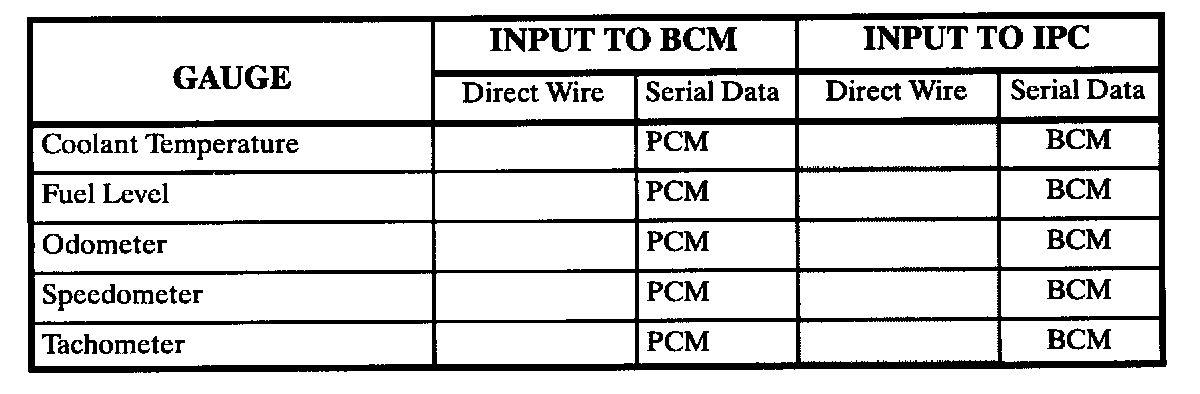 The instrument panel gauges are controlled by the Body Control Module (BCM) via the serial data link to the Instrument Panel Cluster (IPC).